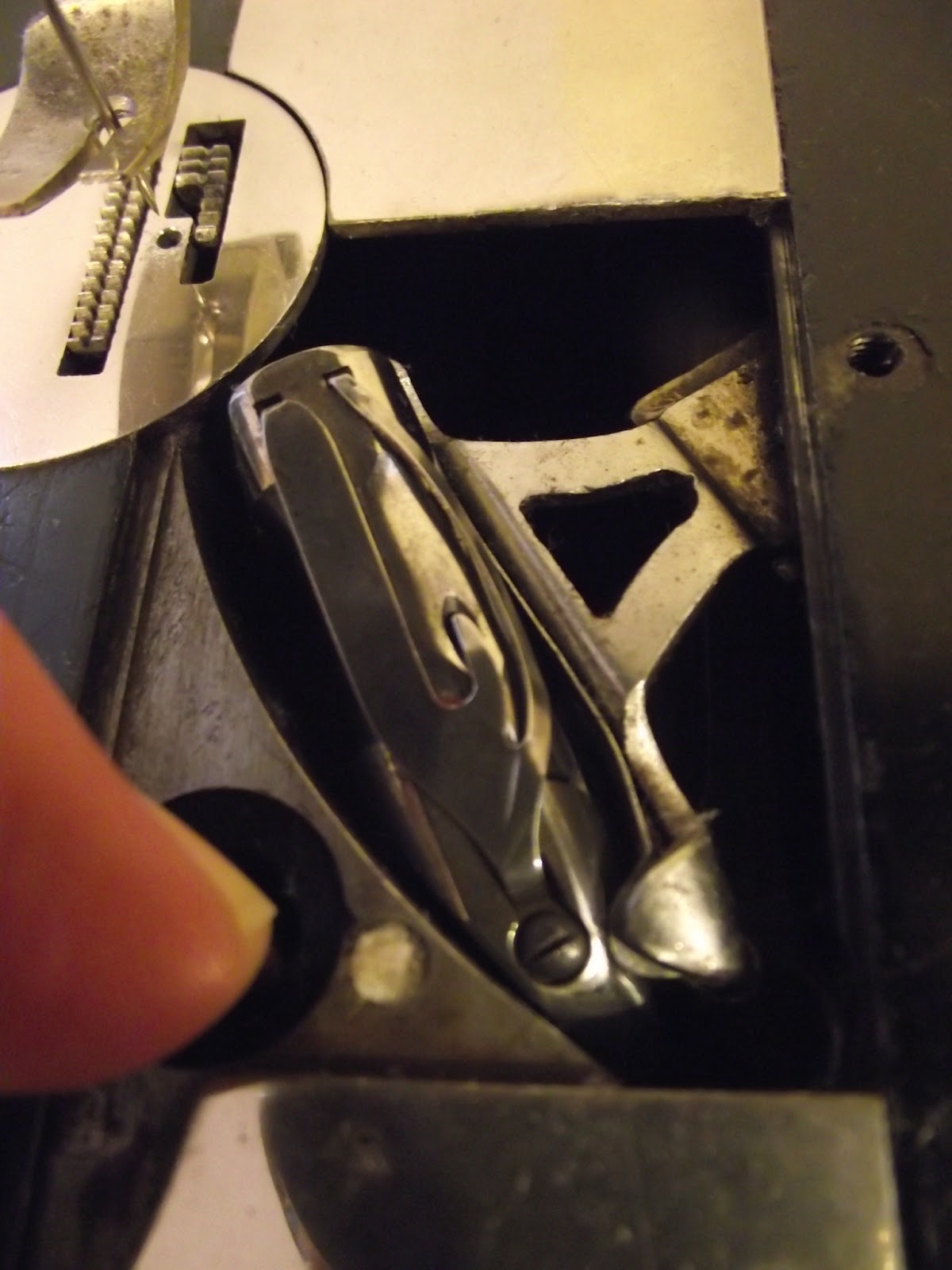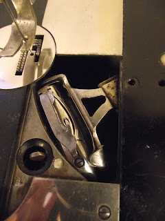 The shuttle moves from side to side in a straight line behind the needle. It fits snugly into its little bed, as shown in the second photo where I have slid back the plate.