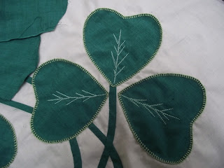 A bit of machine stitched detail can liven up the appliqué. These veins on shamrock leaves were added from the right side, so it is the top thread showing. A bit of uncomplicated detail can be added without a pattern - just make it up as you go along.