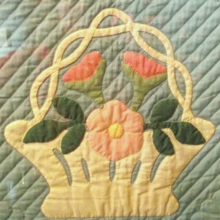 This is a detail from another of the quilts at the American Museum. It was made by a lady called Alzona Maria Green in New York in about 1932. It is thought to have been made from a kit. The quilting was done by an Amish church group in Iowa. The overall effect of the colours, soft blue and cream with pinks and greens, is wonderfully restful. No doubt it was more vibrant when it was new.