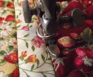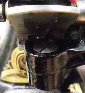 This is a bit irritating. I was looking forward to trying out a bit of free motion work on the 201K treadle and found that my hopping foot wasn't compatible. The lever above the needle clamp stops dead when it reaches the screw on the cylinder that contains the needle bar, so the needle can rise no higher than shown in the picture. The screw is essential because it fixes on the last but one hook that the thread passes through. My brother in law looked at this picture and suggested that because the lever doesn't actually need to be so long the end could be sawn off to give it clearance. He tells me he has the tools if he wants me to do it. Otherwise, I can get a different type of hopping foot. Agonising decisions. Update - Decision made... I've had a think and had good look at how much extra lever there is to play with. When the foot is attached to the 15K and the needle is in the highest position there is a good quarter of an inch spare at the top. You can guarantee that if we tried cutting the lever to fit the 201K we would shave off a fraction too much. I am going to get another type of foot for the 201K - could be interesting!