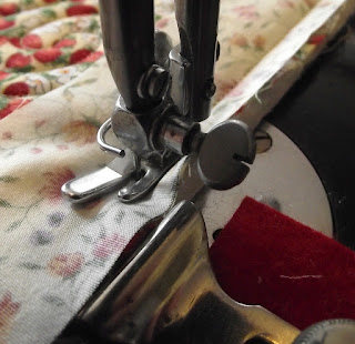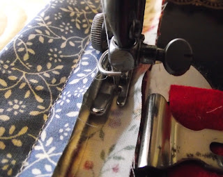 I use strips measuring one and a half inches wide for the top binding, and two and five eighths of an inch for the back binding. The seam guide is set to give a seam allowance of three eighths of an inch. For the first line of stitching, I put the folded strip on the underneath and the top binding on the top of the quilted panel. The machine I have been using is the 1949 Singer 15K hand machine, with the hinged regular foot attached.