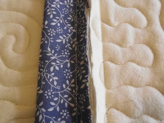 Once these two lines of stitching have been done, I lay out the panels with the two edges together. With this project I usually find that there is a bit too much bulk for the edges to lie flat against each other. This is because I have been using brushed cotton for the backing and polyester wadding - when I made the Queen's Diamond Jubilee Quilt I used cotton wadding and standard weight quilting fabrics, so the edges lay flat first time.