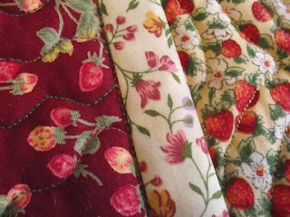 Work on the bedspread for my daughter has slowed down a bit, probably because it is nearly finished and I am trying to get out and do some gardening when the weather will let me. I have quilted enough pieces to make a border but haven't sewn them together yet. These strawberries will be in the border somewhere... am I talking about quilting or gardening??