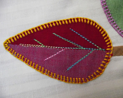 It is a while since I did any appliqué, and I had forgotten how time consuming it can be. The fiddliest part of the process is sorting out the tiny scraps to make the leaves, but I am enjoying all the different colours, trying to make each leaf slightly different.