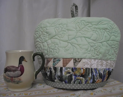 Every finish calls for a quick celebration of some sort - in this case a mug of tea. The large mug has tea in it, and the tea pot is under the cosy. At the moment I am having a bit of a sort out in the sewing room, and have finally got round to making cosies from a panel that I quilted with a hawthorn design a couple of years ago. The panel was large enough to make two cosies. As soon as I have put on the binding around the bottom of the second one, this one will have a twin.