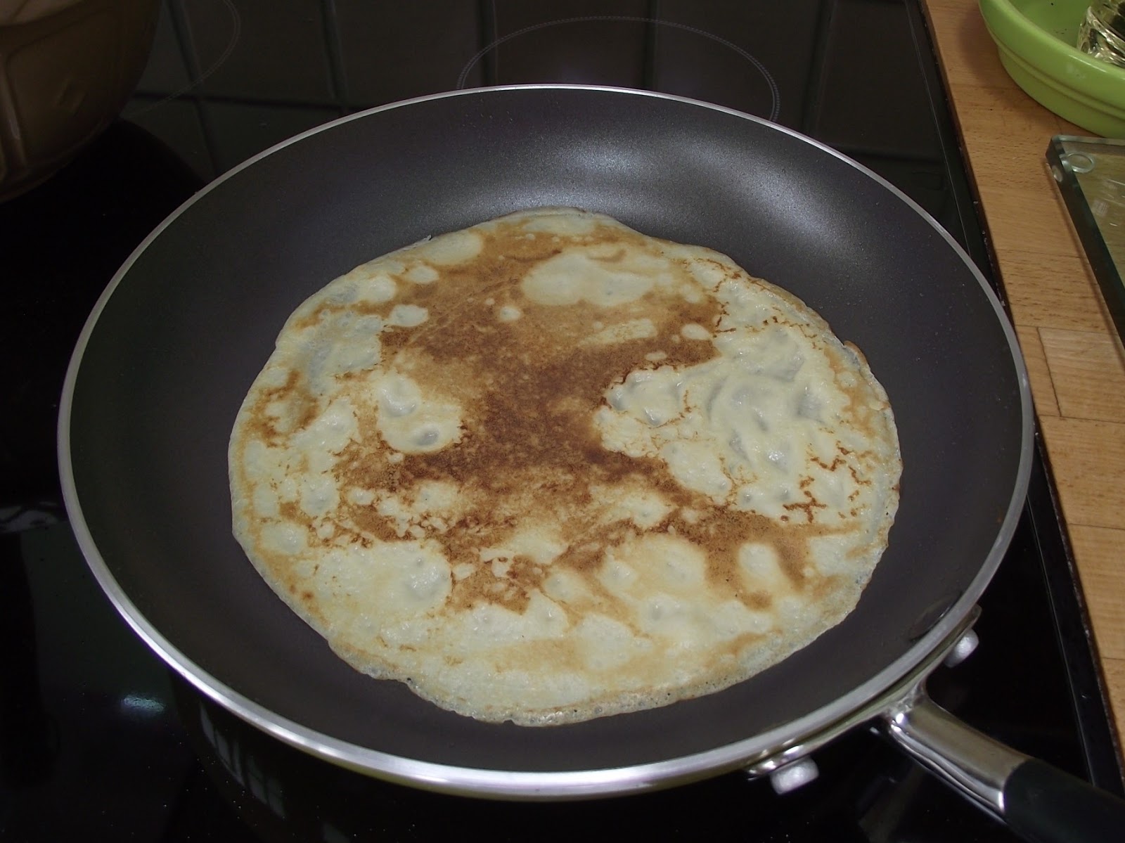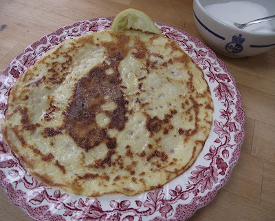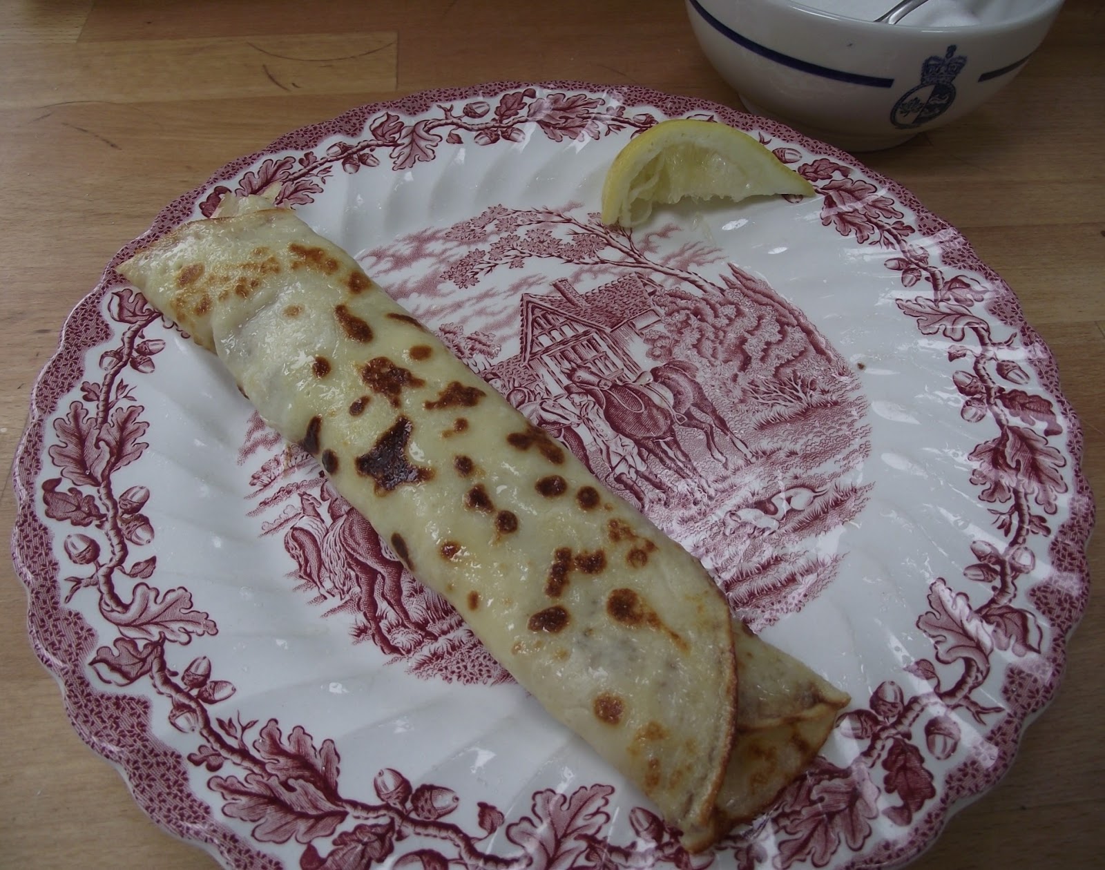 This is the traditional pancake for Shrove Tuesday, the annual pre-Lenten treat, which is almost the size of a dinner plate, heavy enough to sink a battleship if made too thick, and tastes best if fried in lard. Make sure you use a clean frying pan that has not previously been used for frying onions or garlic. Children will taste a rogue flavour in a trice and complain loudly.
