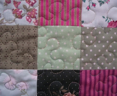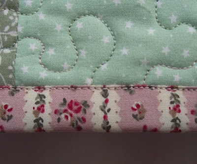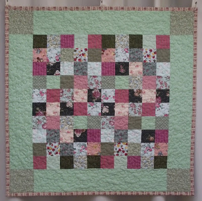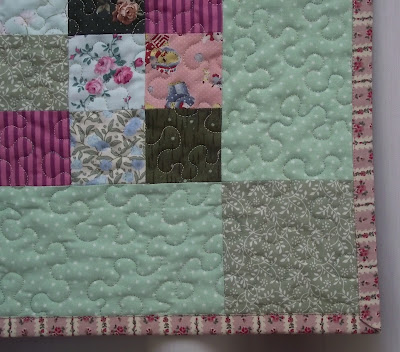 All the little squares are made using the same fabrics as in the pink quilt I finished a fortnight ago, with the exception of the bright green, which I added in so it would tie in with the border.