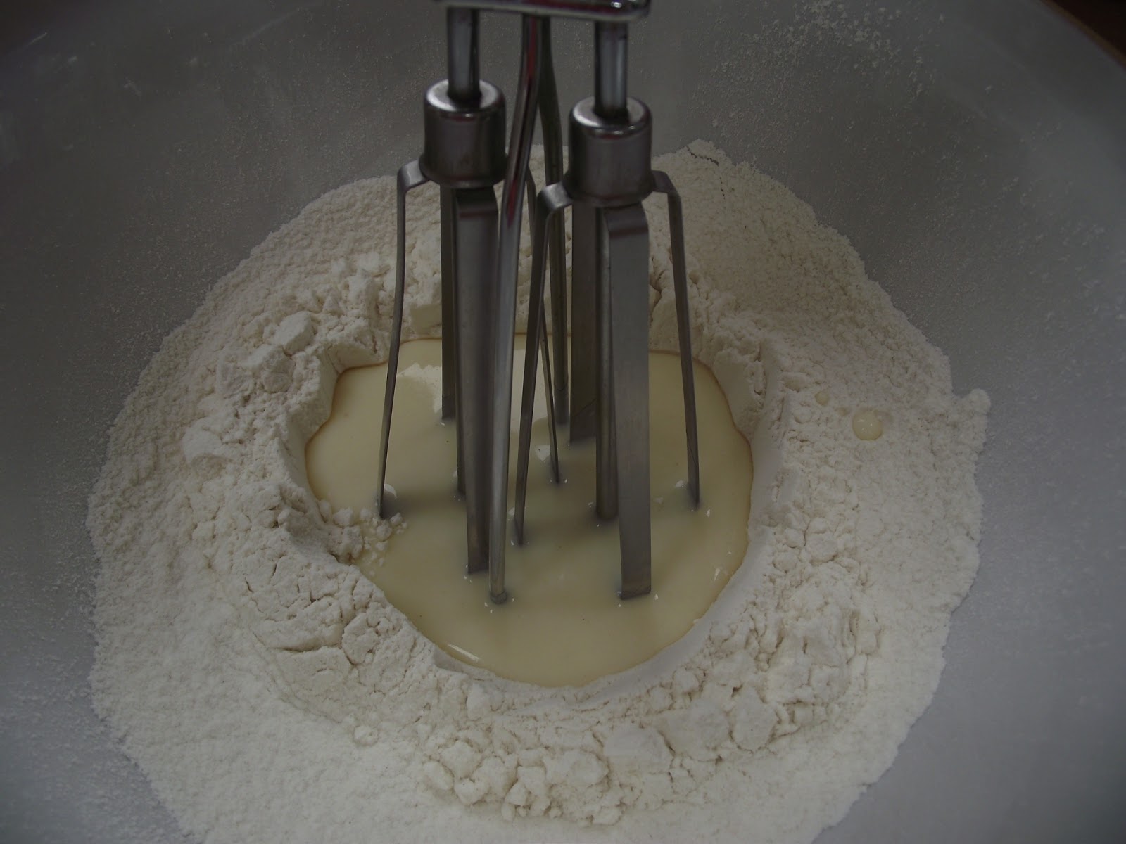 Fill the well with some of the milk and egg mixture, and start mixing in the flour to make the batter. To prevent lumps forming, keep the whisk in the centre of the well.