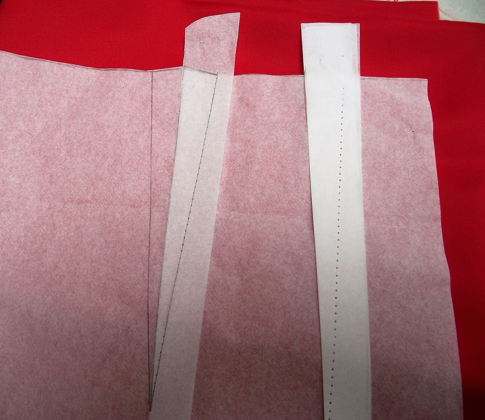 Here is the top strip laid over the dart on the pattern to show how well it duplicates the shape.  The three guides underneath have no pencil lines, just the perforated line.  When using the guides, this perforated line is all I need, but the dots could be highlighted by a pencil line drawn over them if necessary.