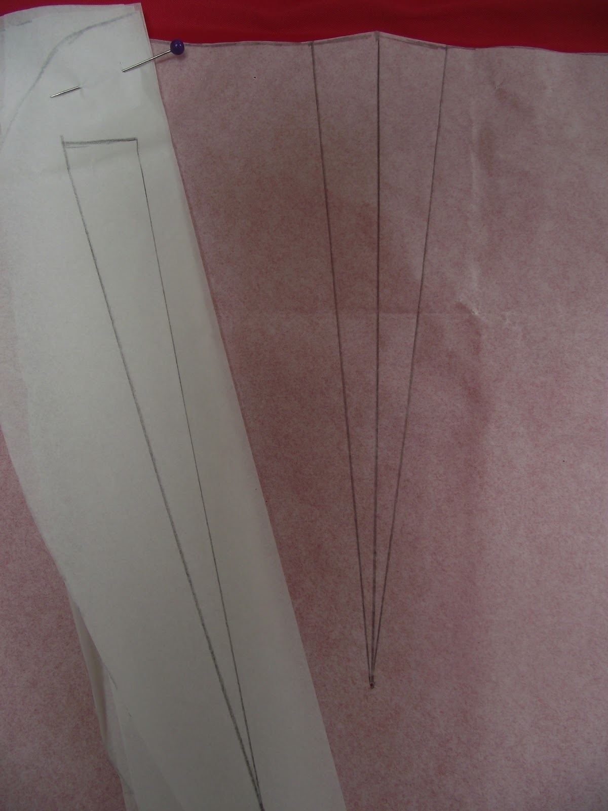 The first picture shows the pattern piece for the back of the skirt.  There is a central back seam, so I have cut two mirror image pieces for the garment.   To the left of the picture is the guide I have traced, with the central fold line of the dart on the left and the stitching line on the right.  Because I am making four of these darts in total, two on the dress and two on the lining, I have pinned three more strips of tissue underneath the top one so I can make all four guides at once.