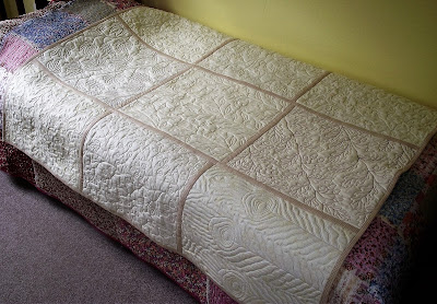 Here it is - my most unplanned quilt to date! Nine practice panels that have been stuffed in a bag for about three years are all now joined together and bound into a rather idiosyncratic quilt.