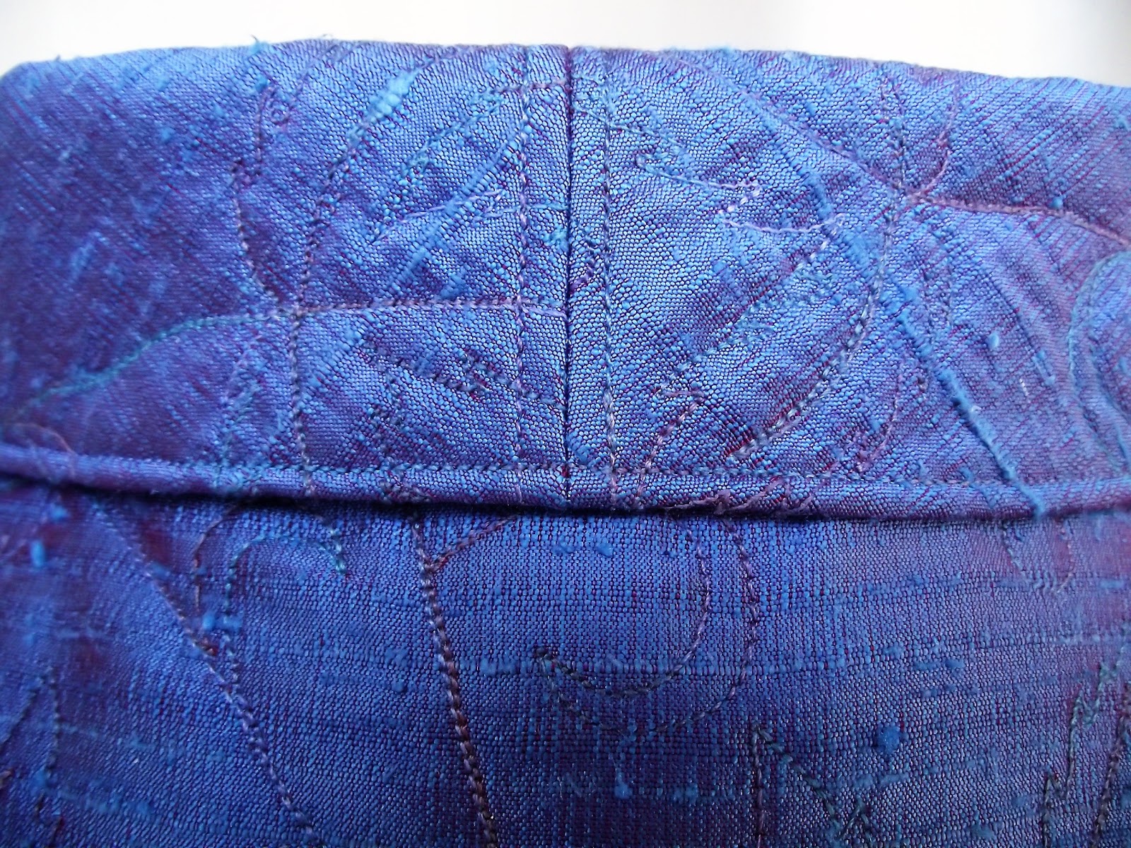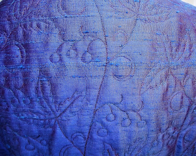 This photo shows the upper section of the back of the jacket. I used the leaves and berries quilting design which I had tested in different coloured threads on the cushion. I went for a thread with minimum contrast so as not to distract from the shot effect of the silk.