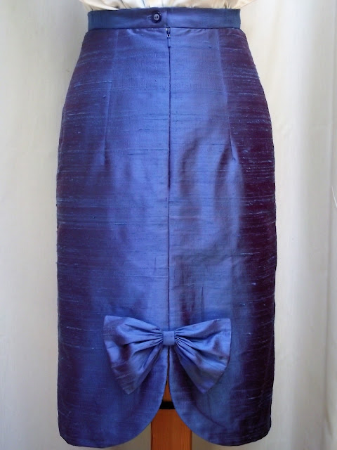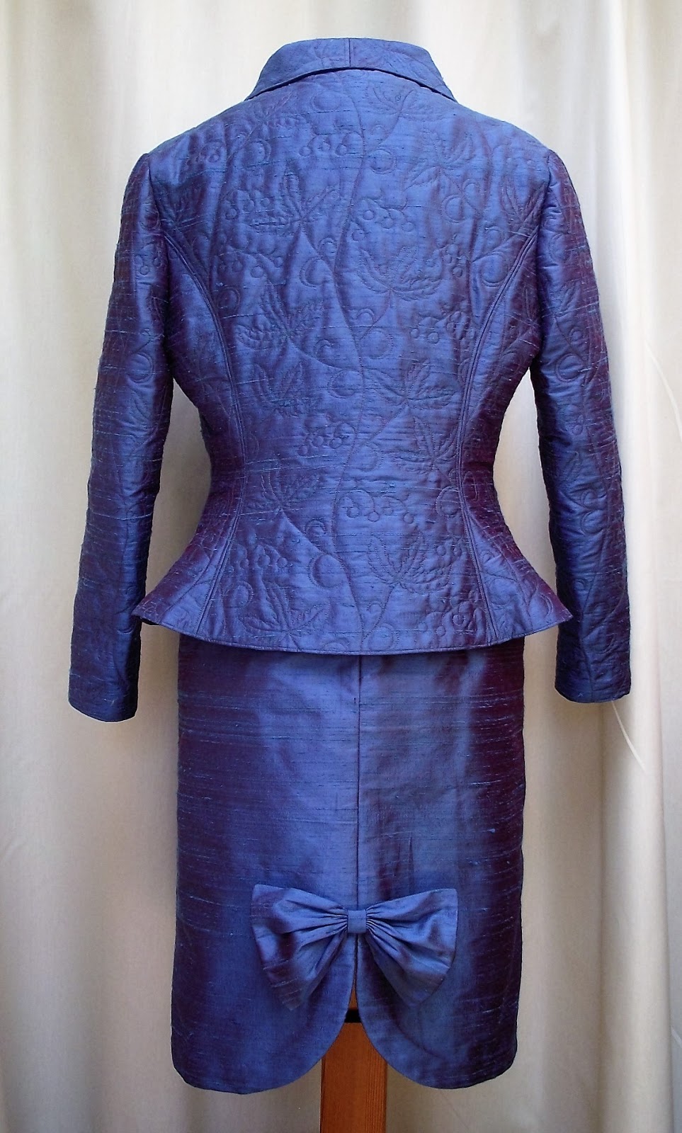 Rather than have a pleat or straight vent at the back, I made an edge to edge opening with curves echoing the lower front of the jacket. The curve on the jacket just happened to be exactly the same size as one of our plates, so that came in handy when drafting the skirt pattern. Then to add just a slight touch of raciness, I stitched on a large bow.