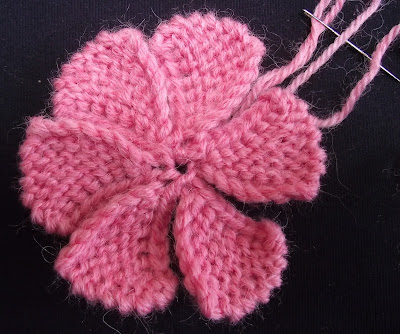 This flower measures three and three quarter inches across.  Because I wanted a sturdy and firm finish, I used a double strand of double knitting yarn on 4mm needles (no. 8 in the old sizes).  Knit stitch is used throughout.