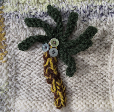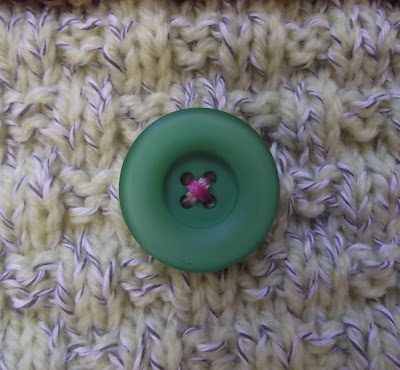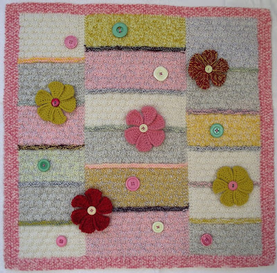 ... and thickened the pink and yellow yarns to the same weight as the chunky cream and beige, which can be seen on the left of this picture.  The whole thing is finished off with buttons and knitted flowers, and is now ready for someone who needs a bit of extra warmth and comfort this winter.