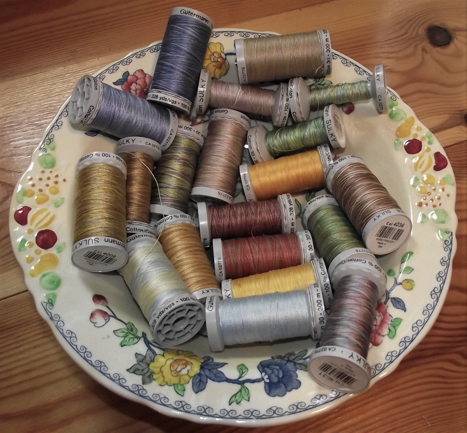 Every subtle shade in variegated thread helps build up the picture.  The trouble I am having at the moment is that the weather is rainy and overcast and the light is dreadful.  Everything looks a dull yellow under the electric light.  At least I have been able to plot the main lines of the composition and am thinking ahead as to how I am going to stitch the bits in between.  It is slow work.
