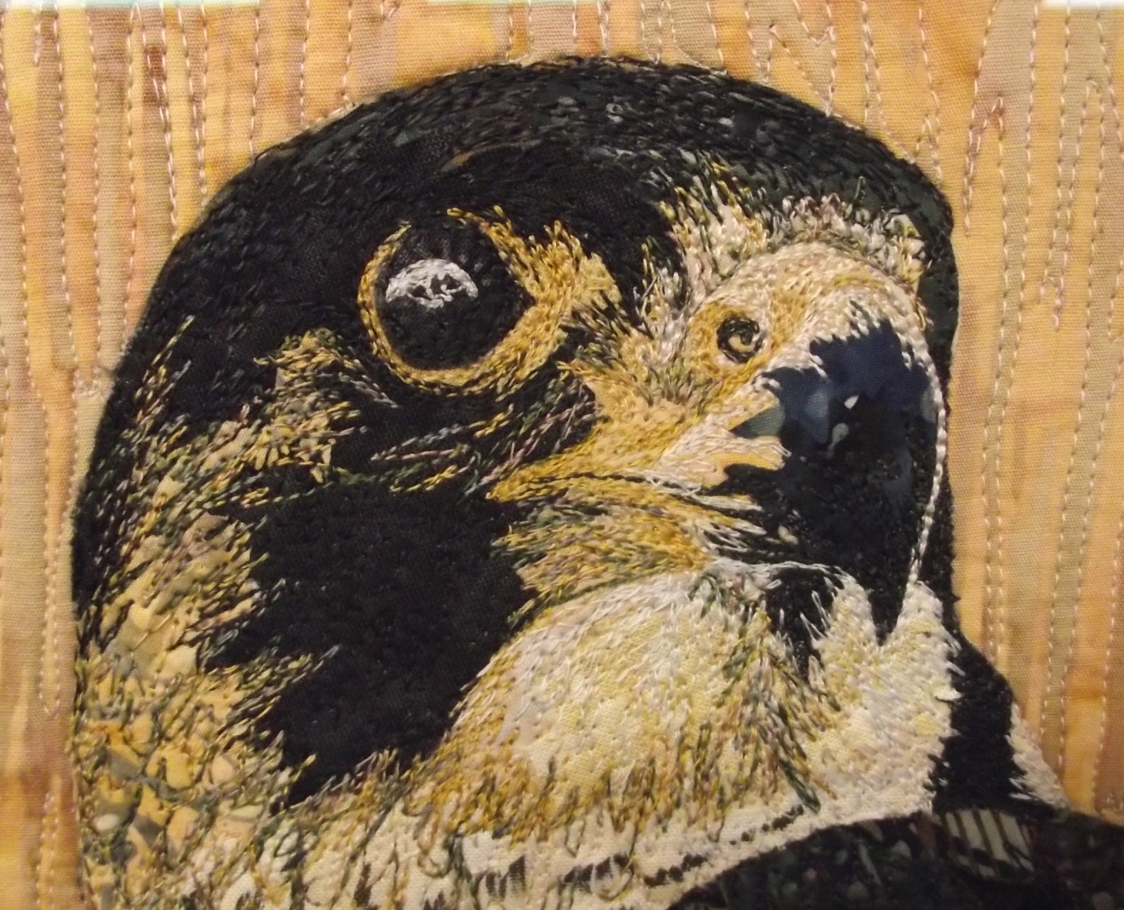 Last week I visited Flights of Fancy, the exhibition of Angela Knapp's work at Midsomer Quilting, and was totally bowled over by her work. She has combined her fascination with birds, her artistry, and her skills with needle and thread to produce a beautiful collection of pictures. As depictions of birds they are incredibly accurate - I identified this peregrine falcon straight away.