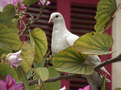 This pigeon might look all whiter than white, but he was being very naughty and pecking at the flower buds on the tree.