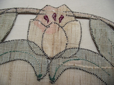 I compared it with a tray cloth that I have because the yellow fabric used for the appliqué is so similar. The stitching on the tray cloth is definitely done by hand, and so much finer than the stitching on the doily, but they certainly seem to date from the same epoch.