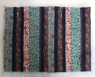 Here are the two finished cosies side by side. Although they are made from the same quilted rectangle, the effect is different because I used them the opposite way round, so each one has a different part showing on top for the flap.