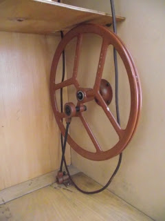 Here is the view inside the cabinet of the Lucznik machine. I expected to find the treadle wheel - seeing the treadle cable lying idle at the right hand side of the machine was a bit of a give away.