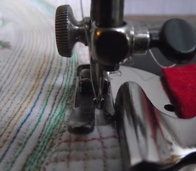 The seam guide keeps these first two lines of stitching straight. It has to be placed as far over to the left as possible, so it is right up against the side of the foot.